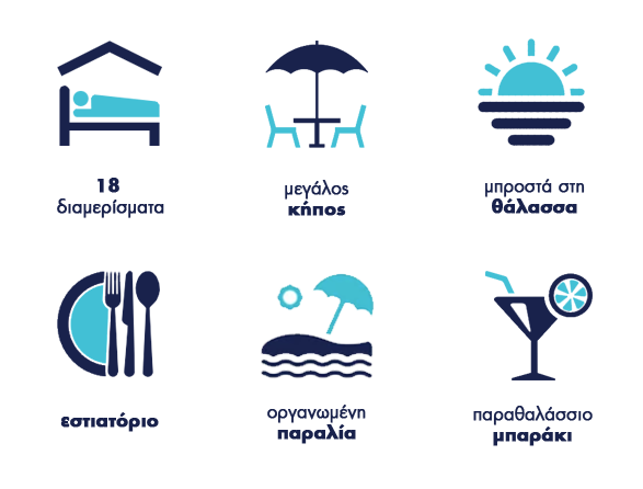 18 ευρύχωρα, ευήλια, επιπλωμένα διαμερίσματα με αυτόνομο μπαλκόνι, μεγάλο κήπο και θέα στη θάλασσα, αποτελούν την ιδανική διαμονή για όσους επιθυμούν ξέγνοιαστες και ευχάριστες οικογενειακές διακοπές.